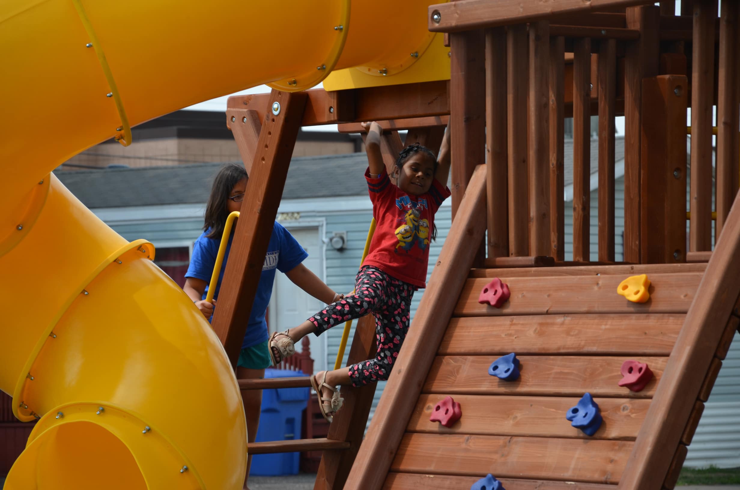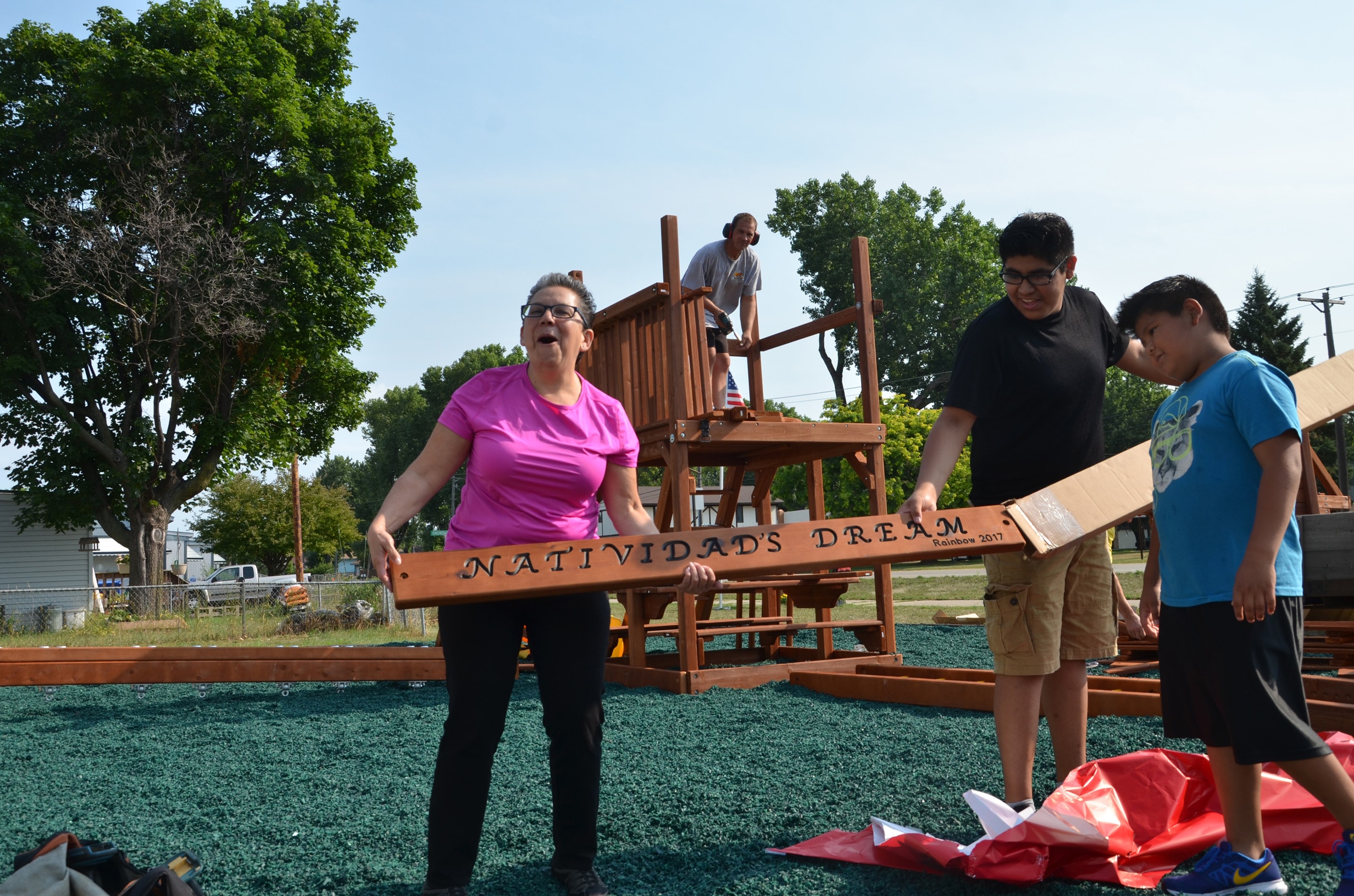 Two workers from Rainbow Play Systems, had the structure completely assembled in less than three hours, providing a huge surprise for the neighborhood kids.
