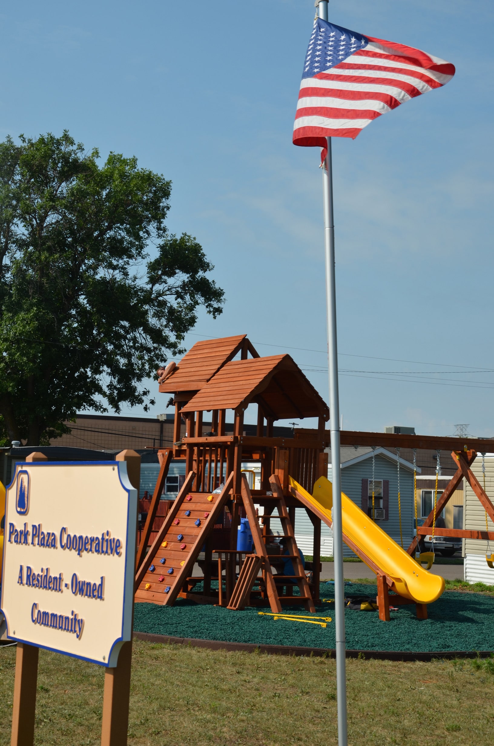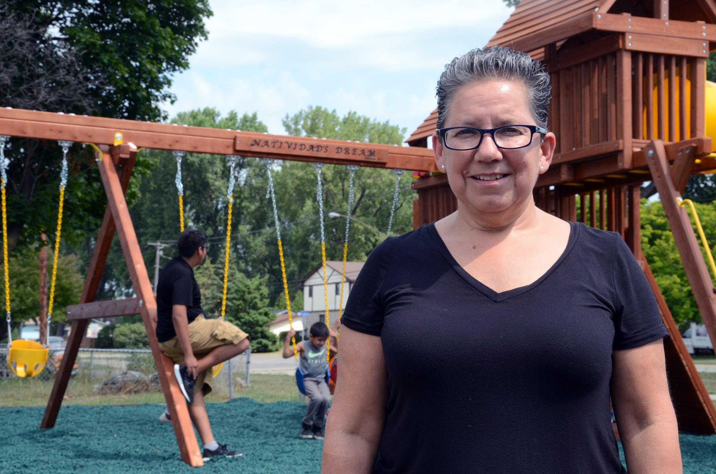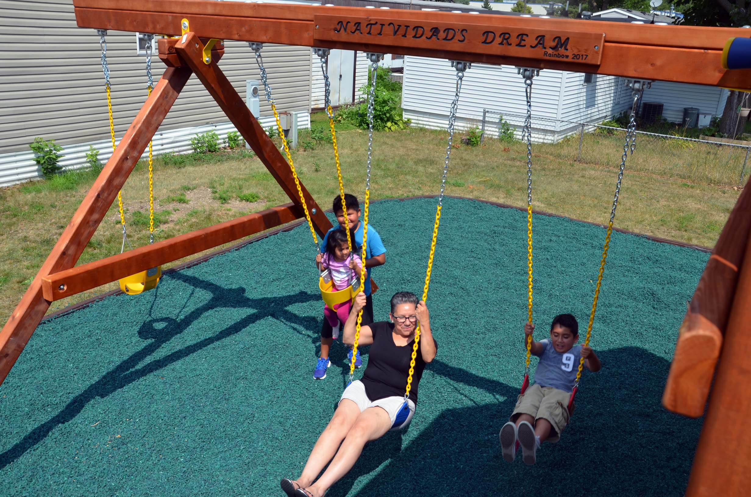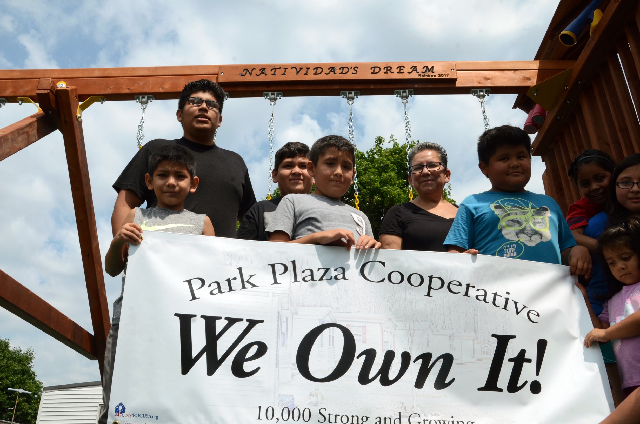 Park Plaza President Natividad Seefeld wasn’t expecting a surprise, but was in for one herself. The co-op Board, which works with Northcountry Cooperative Foundation for technical support, had asked the playground company to include a plaque in recognition of Seefeld’s years of dedication to Park Plaza. The sign, hung atop the swing set, reads, “Natividad’s Dream.”