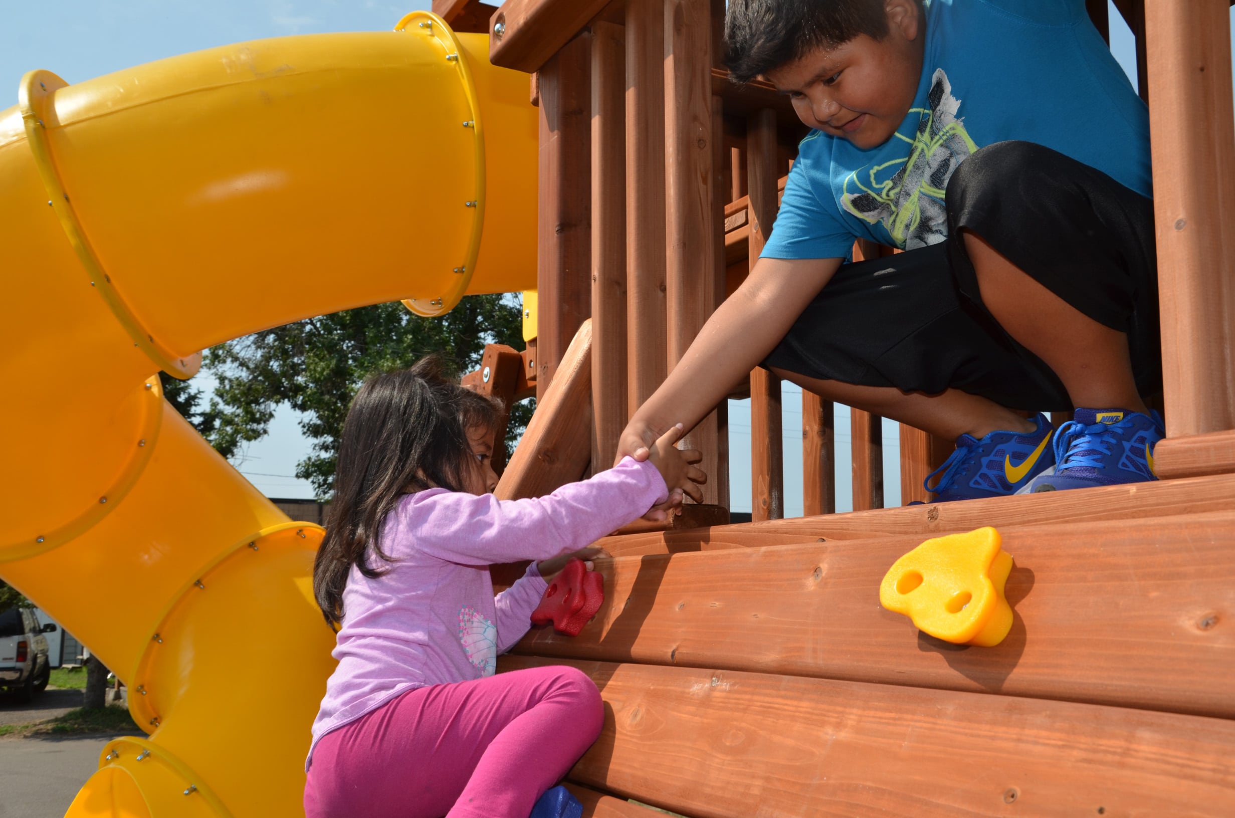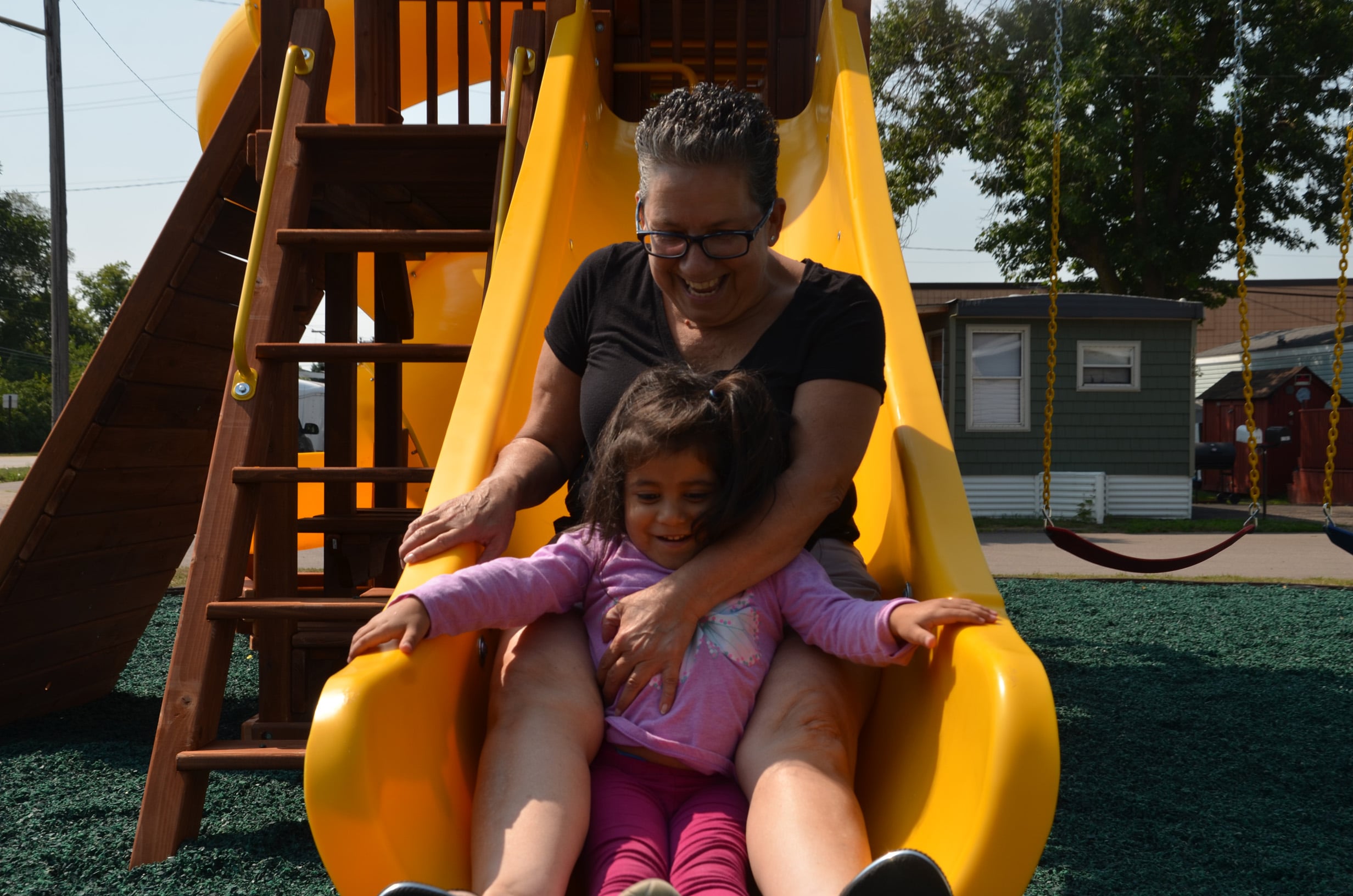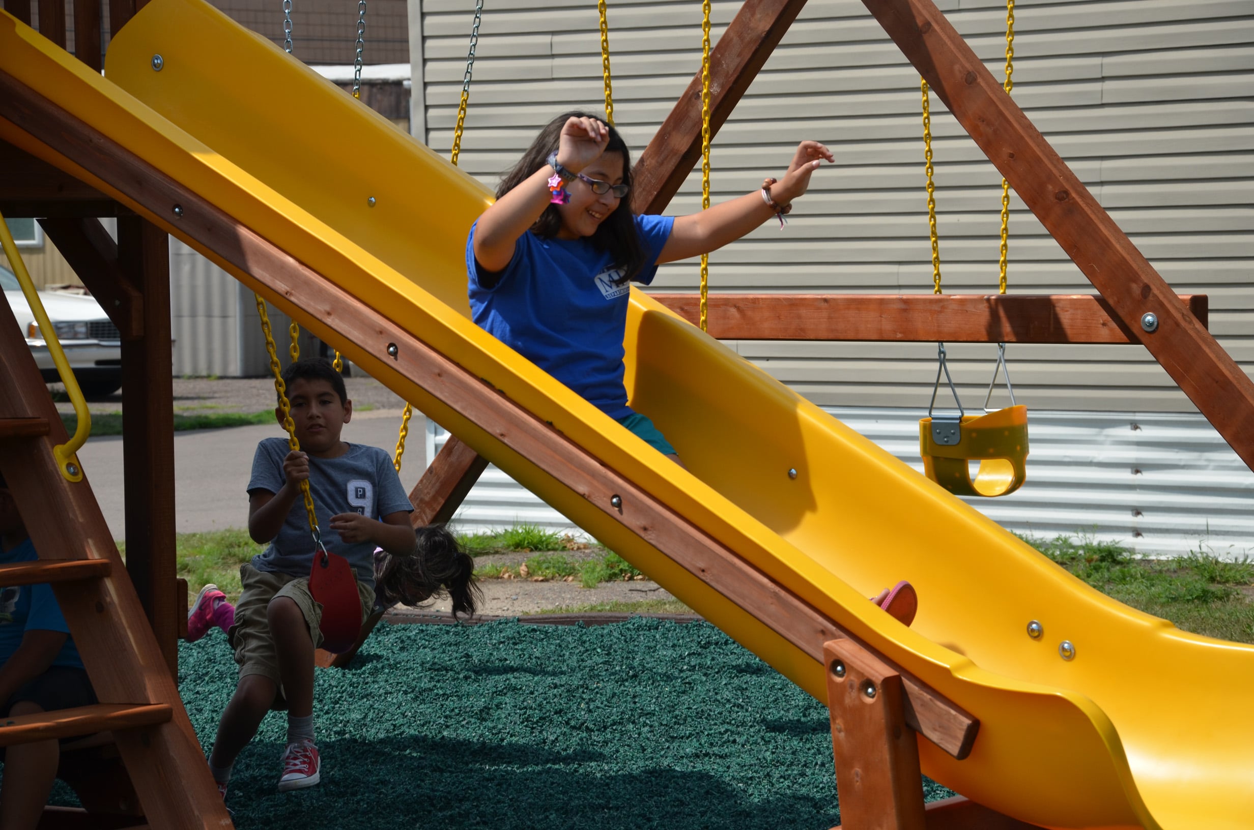 “This is great,” he said, adding that none of his friends outside Park Plaza have something so close to home. His smile spoke of his excitement as he took the inaugural ride down one of the two slides before dutifully helping his younger sister into a swing and down the curly slide.